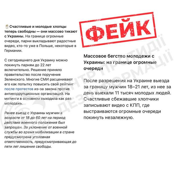Також було підкреслено, що матеріали російських пропагандистських джерел умисно маніпулюють вирваними з контексту коментарями користувачів у соцмережах, формуючи помилковий образ масового виїзду молоді з України. Нагадаємо, зміни до Правил перетину кордону, які стосуються чоловіків у віці від 18 до 22 років включно, опубліковані в Урядовому кур’єрі, набрали чинності, і тепер прикордонники їх застосовують.